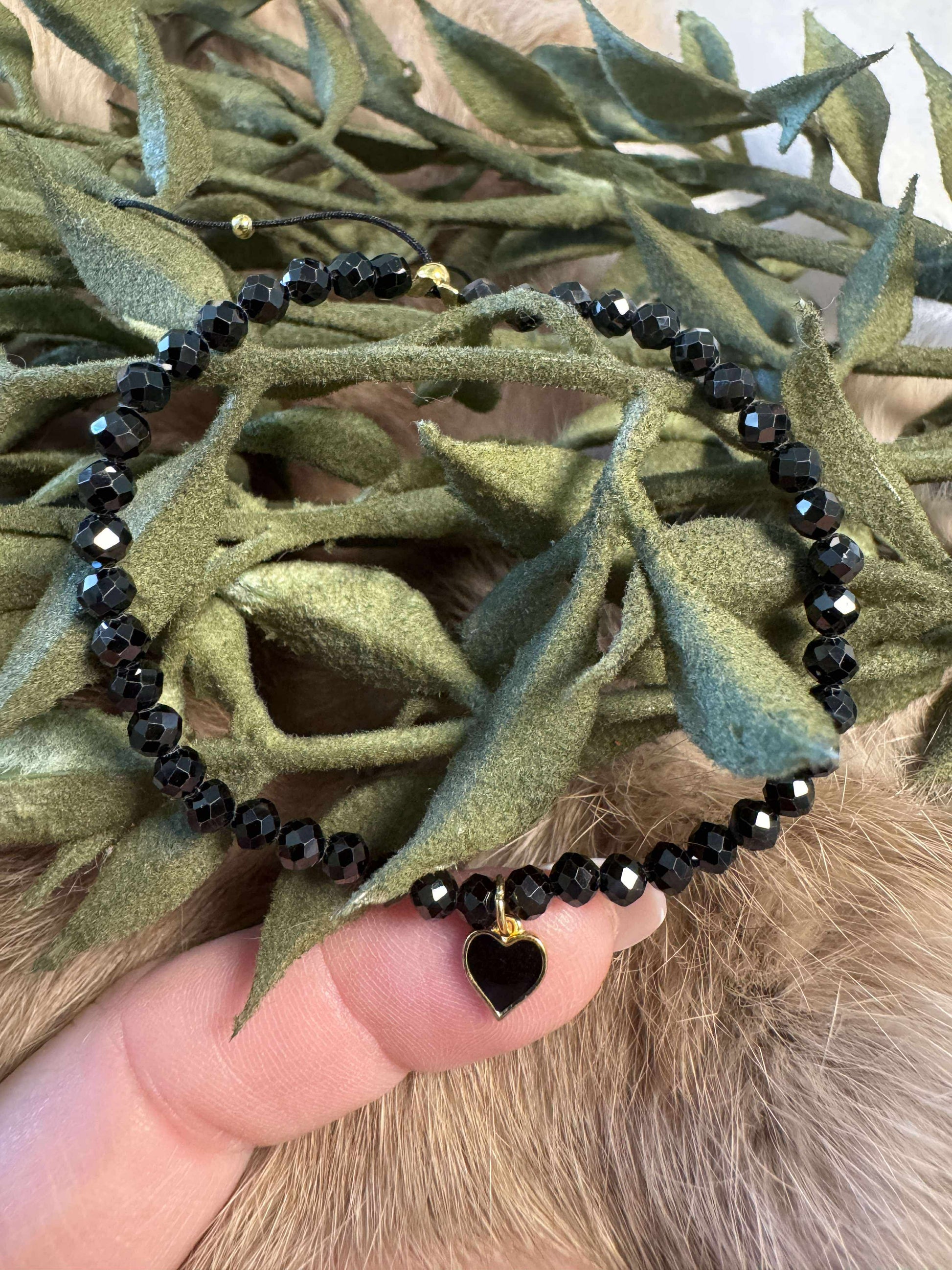 This bold bracelet pairs the sleek shimmer of faceted Black Spinel in Black Tourmaline with the grounding power of a carved Black Tourmaline Heart, creating a wearable shield of strength and protection. Designed to both dazzle and defend, it’s a piece that carries potent energy while radiating timeless elegance.