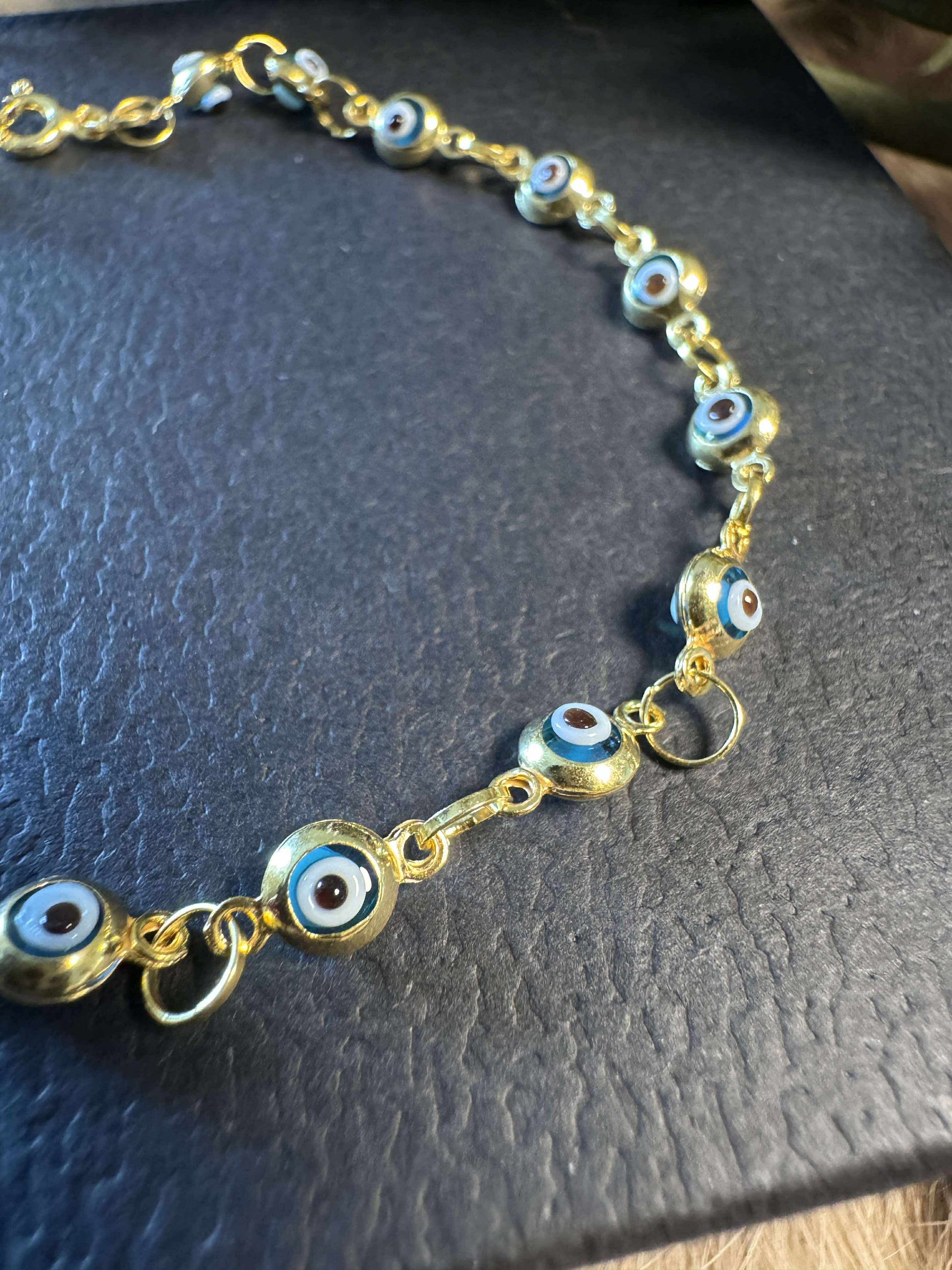 This exquisite bracelet is more than jewelry, it’s a talisman of protection and higher alignment. Each golden evil eye link acts as a watchful guardian, shielding you from negativity and envy, while the addition of Blue Kyanite elevates its energy to a spiritual level.