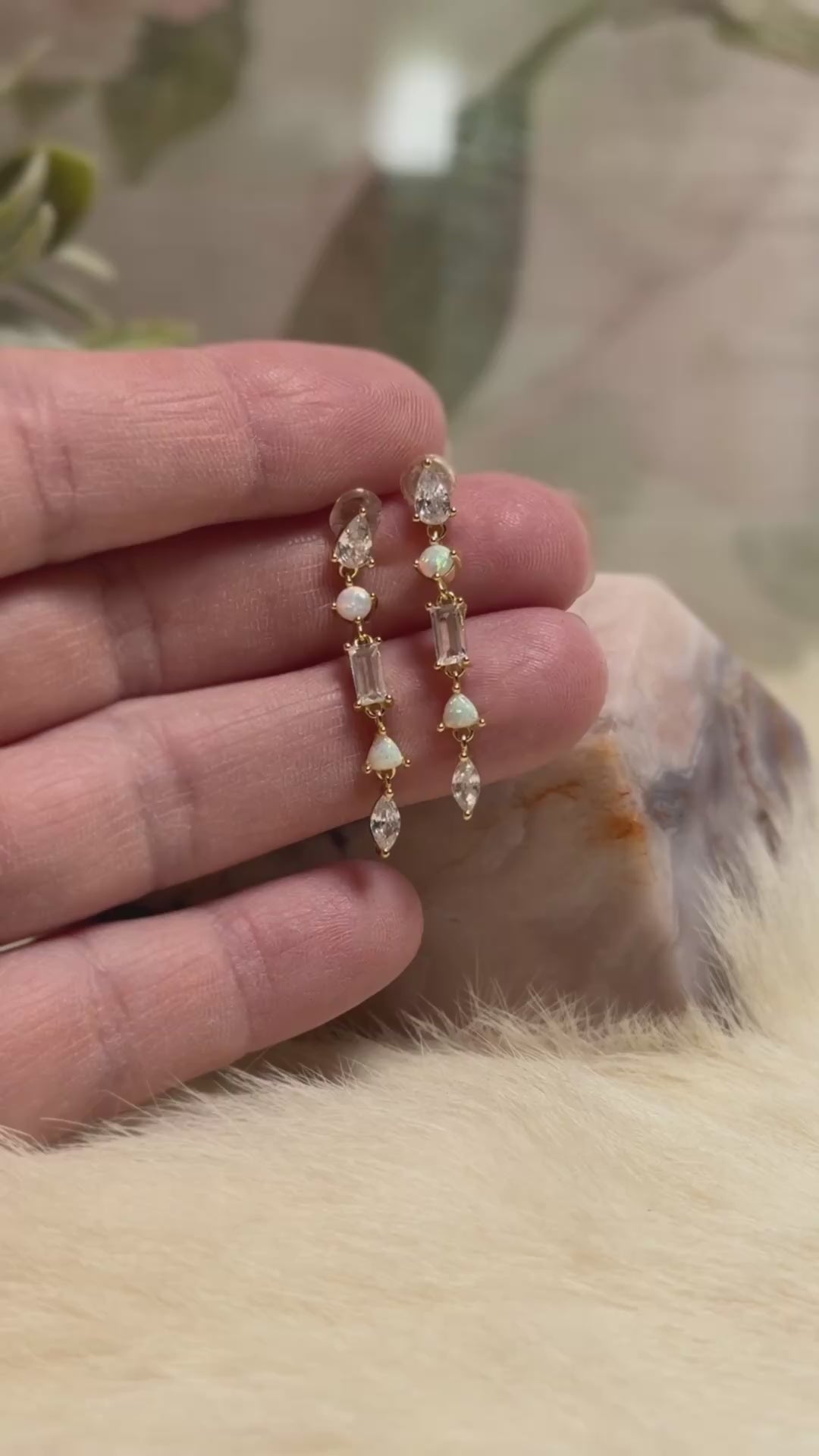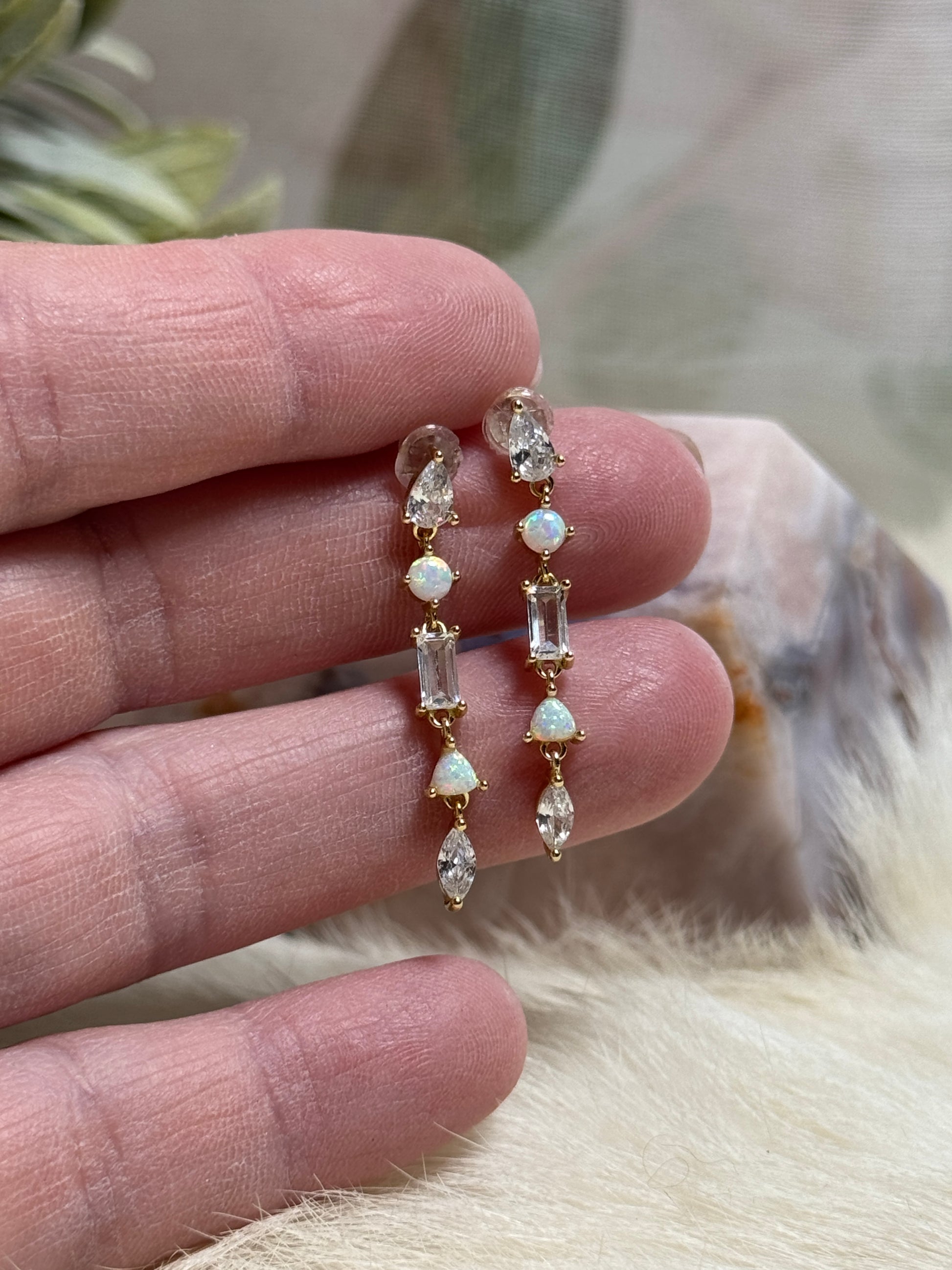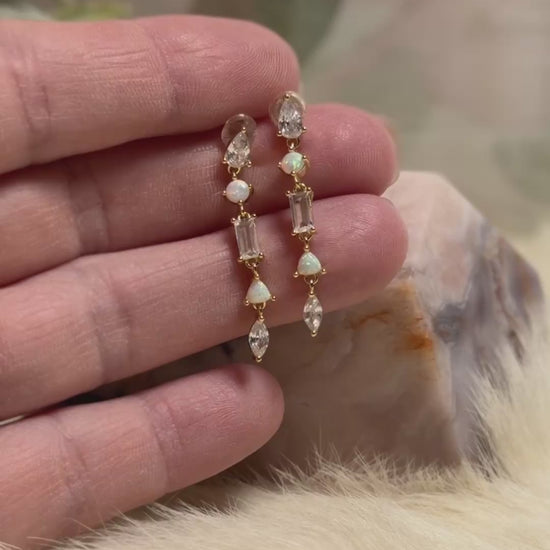 These elegant drop earrings weave together the fiery play-of-color of Ethiopian Opal with the luminous clarity of faceted Clear Quartz. Set in warm gold-tone accents, each stone is thoughtfully placed to create a cascading line of light, from the rainbow flashes of opal to the sparkling brilliance of quartz. The result is a piece that feels both modern and celestial, perfect for moments when you want to radiate your inner magic.