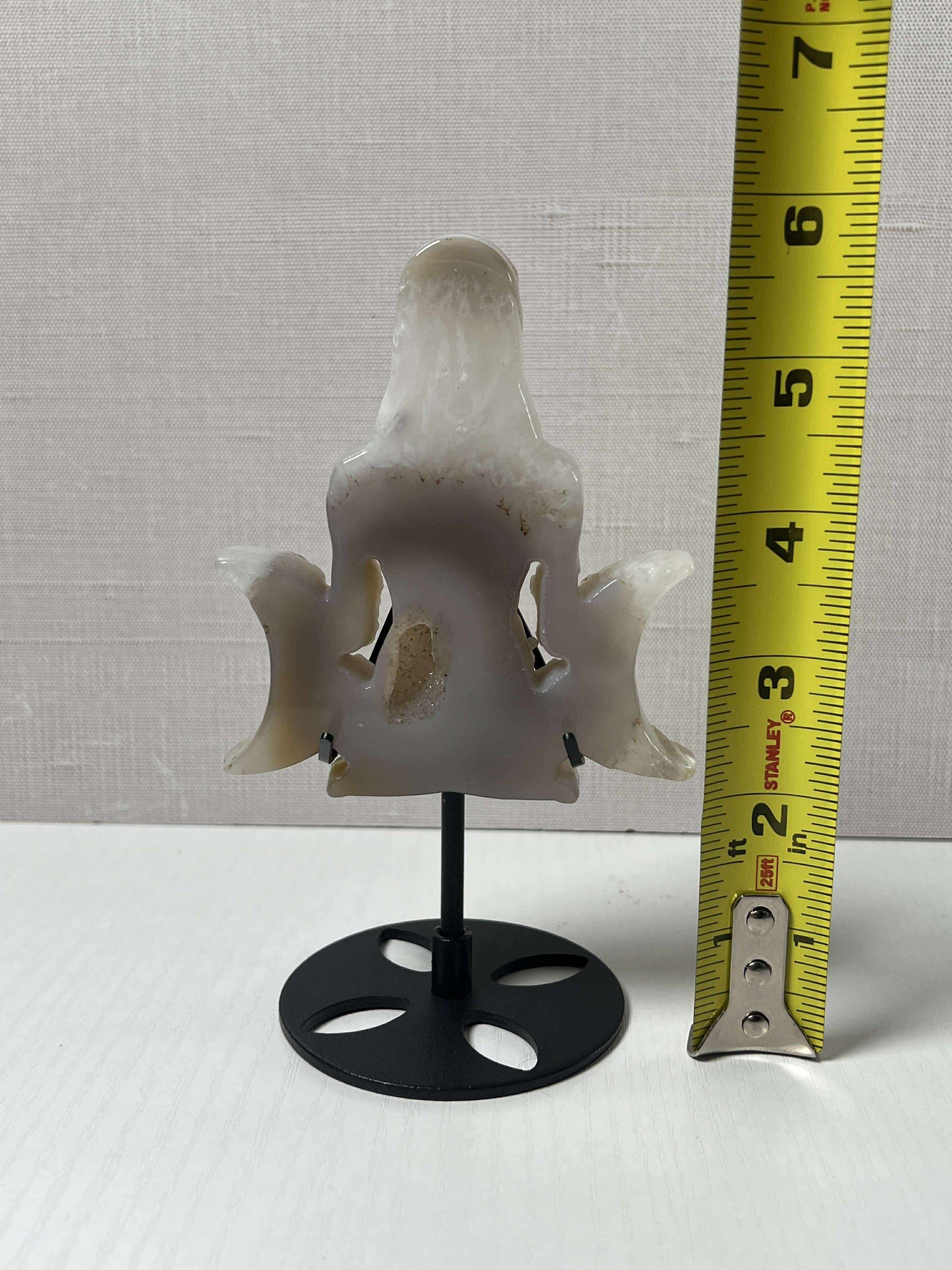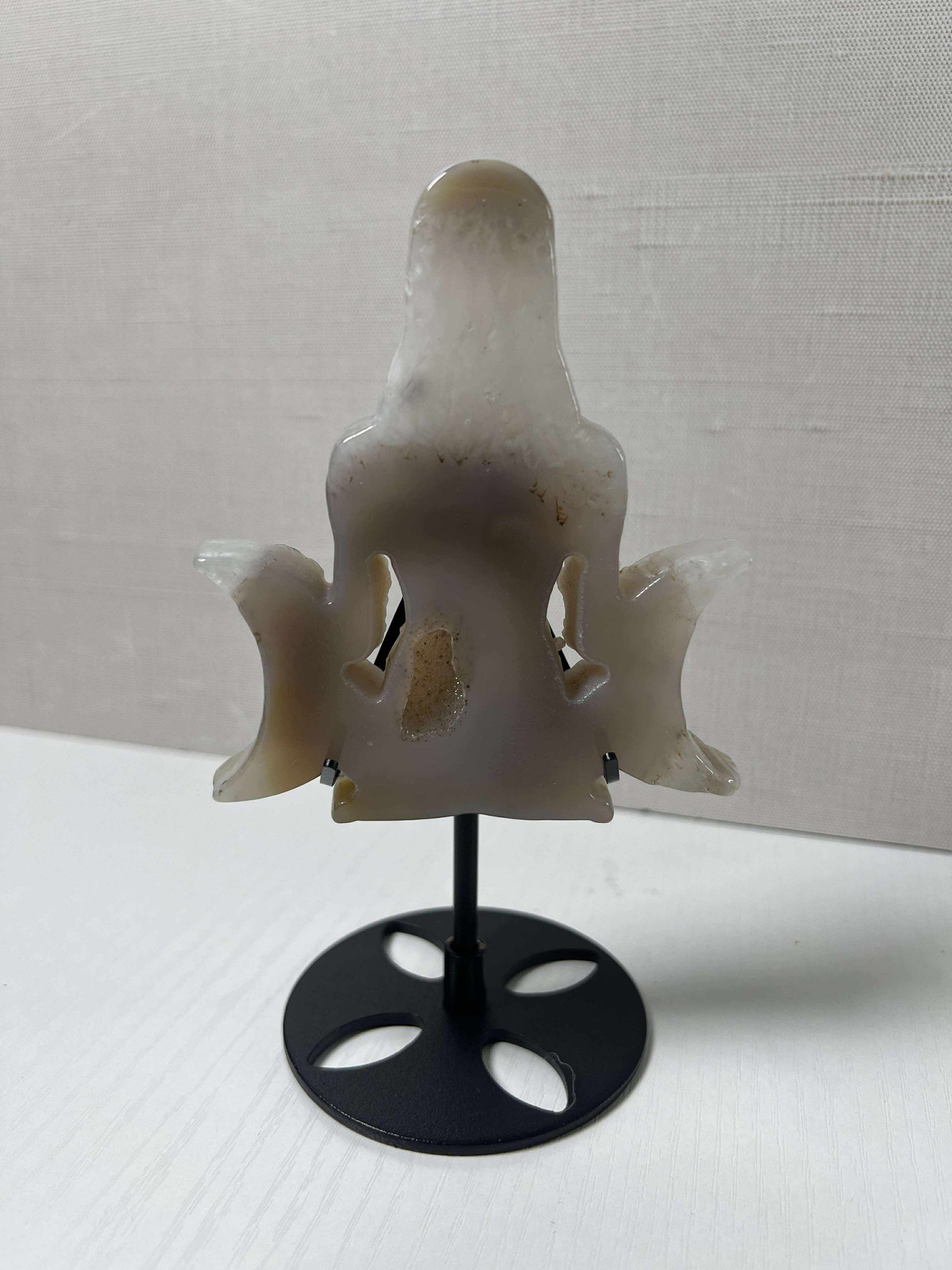 Crafted from stabilizing Agate and naturally hollowed to reveal a glimmering crystal cave, she reminds us that true transformation happens within. She’s here to anchor your rituals, hold space for your healing, and reflect your divine feminine essence back to you… soft, strong, and whole.