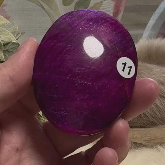 This mesmerizing Plum Moonstone palm stone radiates a gentle yet powerful energy, shimmering with soft plum and silvery flashes that connect you to the cycles of the moon and the wisdom of your own intuition. Shaped to fit perfectly in the palm of your hand, it becomes a soothing companion for meditation, energy work, or simply carrying throughout your day.