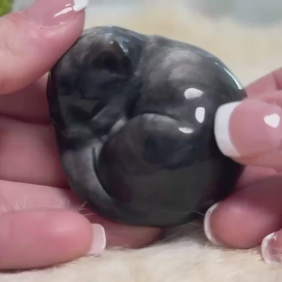 This stunning Silver Sheen Obsidian Cat is moonlight wrapped in mystery, a quiet guardian with a watchful gaze and ancient energy. With shimmering silver flashes across deep obsidian black, it reflects the magic of the night sky and the sacred stillness of inner knowing.