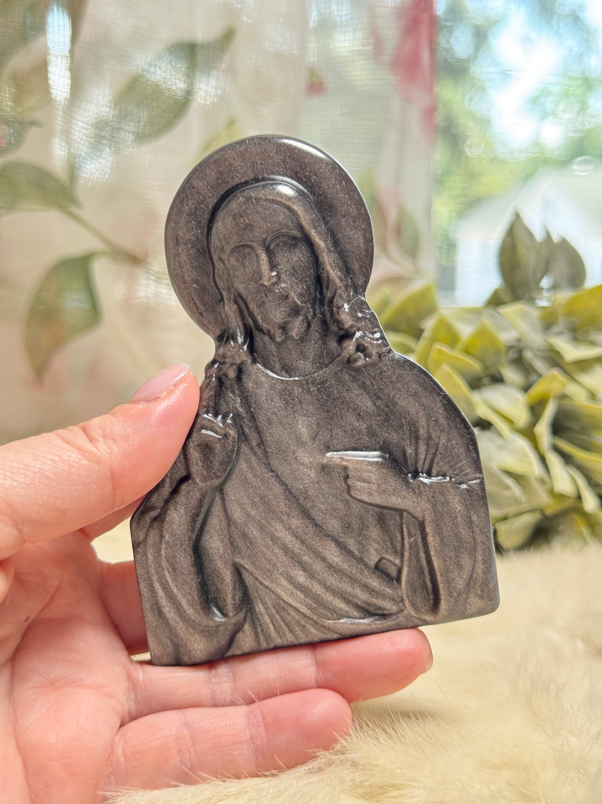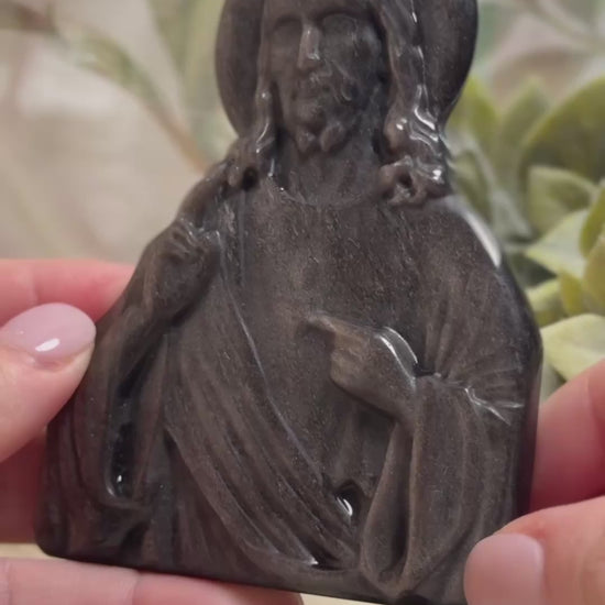 Silver sheen obsidian is a powerful stone of protection, truth, and clarity. Combined with the holy imagery of Jesus, this piece becomes both a devotional symbol and a potent spiritual tool... perfect for prayer altars, meditation spaces, or as a cherished keepsake of your faith.