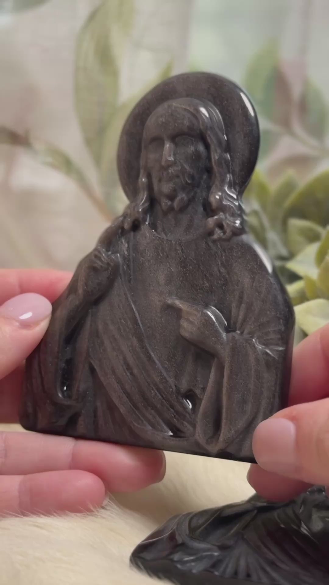 This exquisite carving of Jesus, crafted from shimmering silver sheen obsidian, carries a serene and compassionate presence. Depicted with a radiant halo and the sacred heart, it serves as a reminder of unconditional love, grace, and unwavering faith. The subtle silver shimmer within the obsidian reflects divine light, symbolizing guidance through darkness and the assurance that you are never alone.